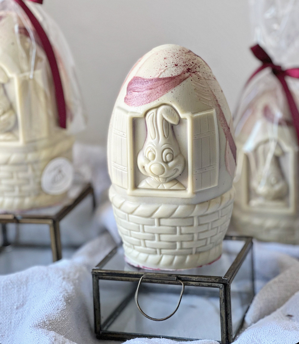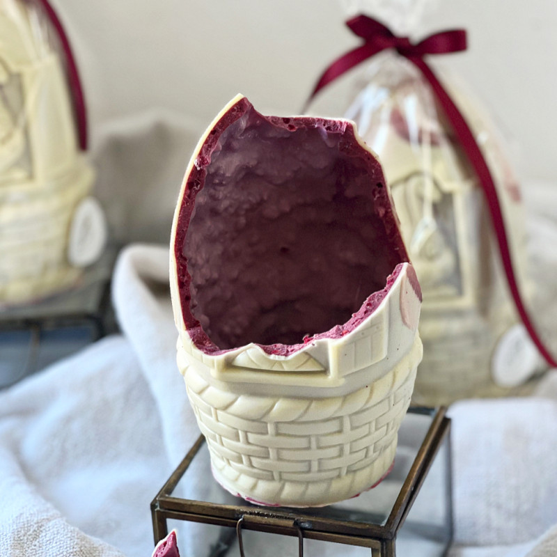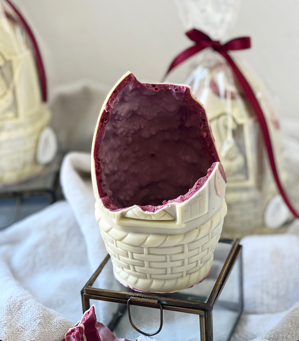 Aussen süße weiße Schokolade und innen säuerliche Himbeerschokolade mit gefriergetrockneten Himbeeren und Knallbrause.