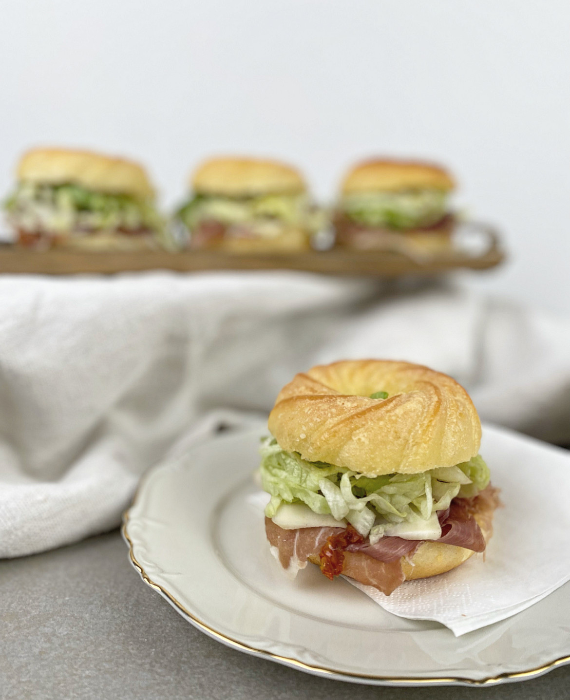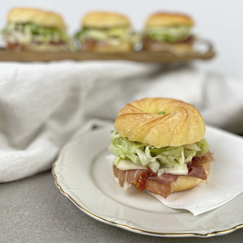 Herzhafter Genuss in der Mini-Guglhupf-Form! Unsere pikanten Guglhupf-Brötchen sind der perfekte Snack für zwischendurch oder das Highlight auf jedem Buffet. Wähle zwischen zwei unwiderstehlichen Füllungen: Tomate, Mozzarella & Pesto für mediterranes Flair oder Prosciutto, Trüffelkäse & getrocknete Tomaten für eine extra raffinierte Note. Frisch gebacken und liebevoll verfeinert – ideal zum Mitnehmen, Teilen oder einfach zum Selbstgenießen!