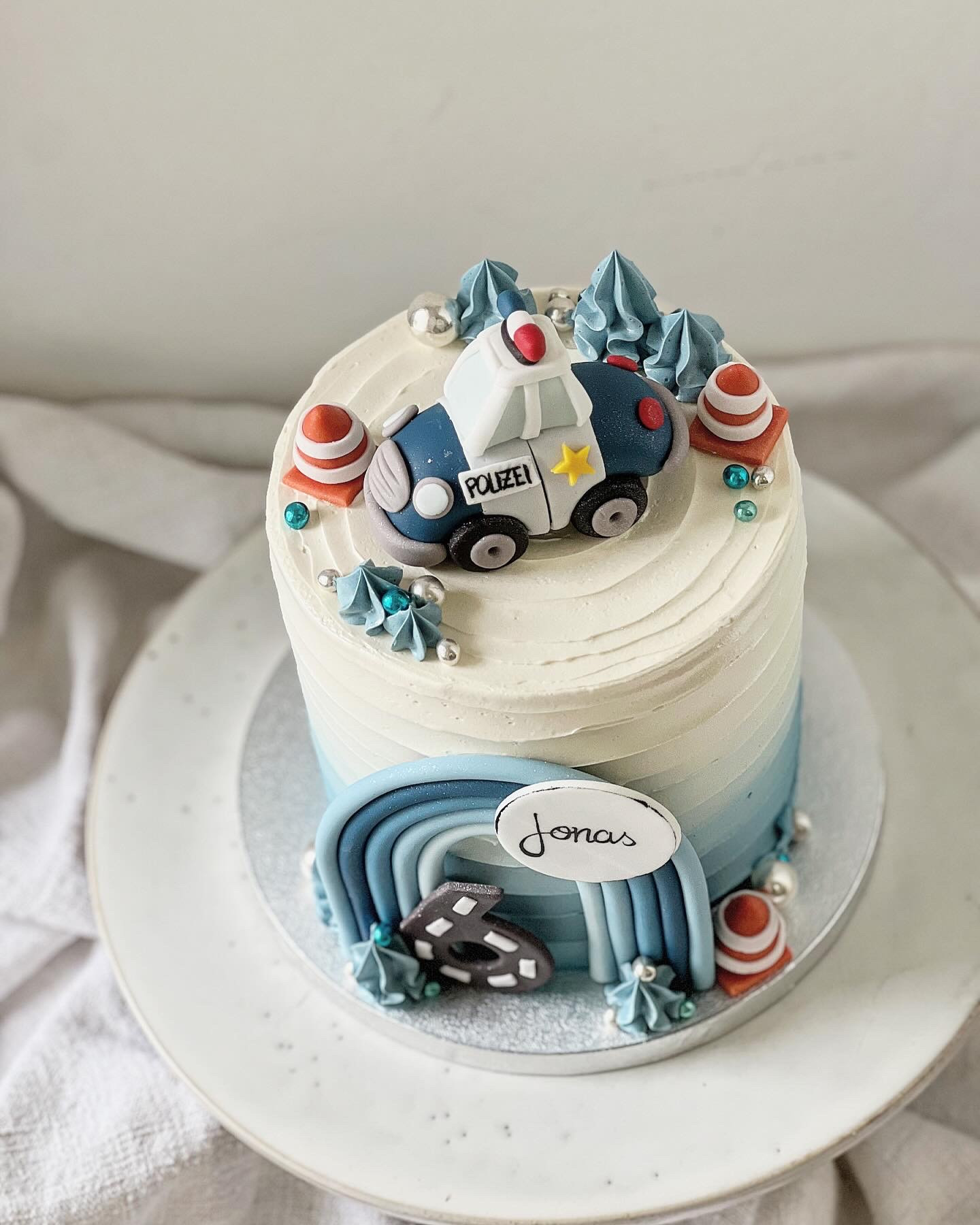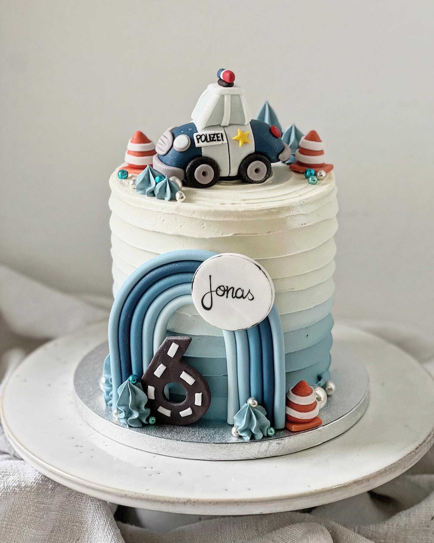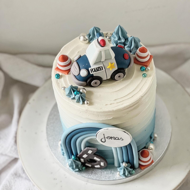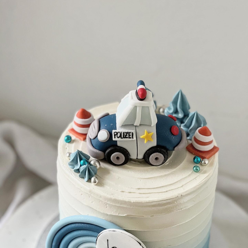 Optisch besticht die Torte durch detailreiche Dekorationen wie ein Polizeiauto aus Fondant
